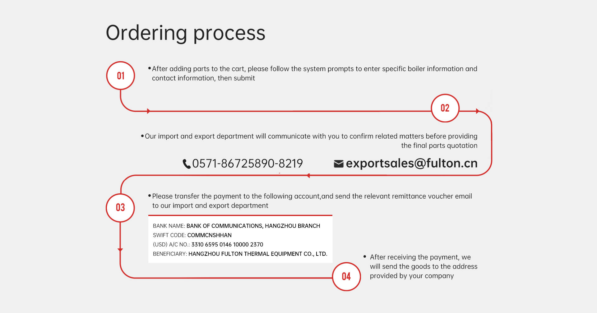 Company Name:HANGZHOU FULTON THERMAL EQUIPMENT CO., LTD.Account Number : 3310 6595 0146 10000 2370 Opening Bank:BANK OF COMMUNICATIONS, HANGZHOU BRANCH